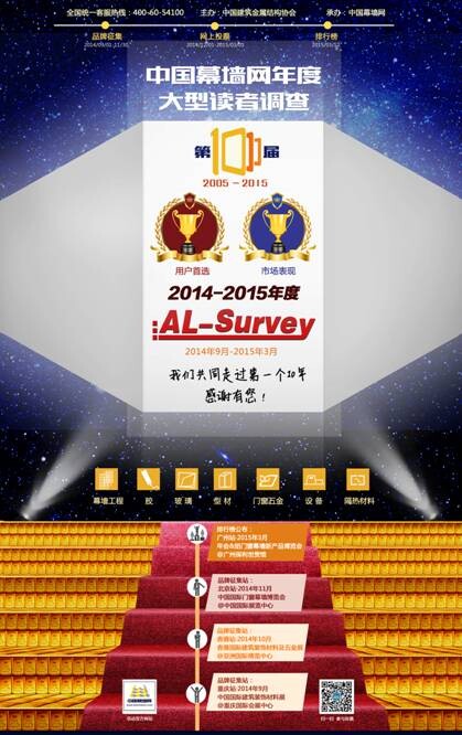 AL-Survey讀者調查活動全稱:中國幕墻網(wǎng)年度大型讀者調查暨“我最喜愛品牌”評選活動。(以下簡稱AL-Survey)我司濟南天辰鋁機股份有限公司作為門窗幕墻機械制造領域的資質企業(yè),攜“天辰”品牌,強勢入圍本次調查活動。通過活動參與者的票