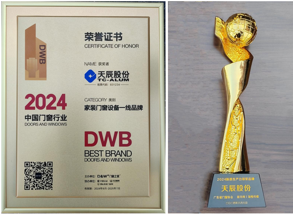 ??在會(huì)議的頒獎(jiǎng)典禮上,天辰股份榮獲會(huì)議晚宴總冠名、“家裝門窗設(shè)備一線品牌”以及“新質(zhì)生產(chǎn)力領(lǐng)軍品牌”的榮譽(yù)。