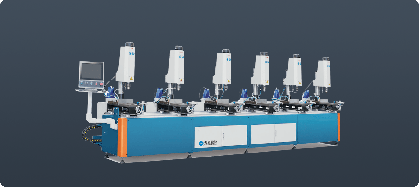 適用于鋁幕墻型材三個(gè)面的孔槽鉆銑加工及高精度大截面型材45°~135°任意角鋸切下料,配備6組高速電主軸及不同規(guī)格刀具,避免換刀,并可上下面孔槽的同時(shí)加工,效率極高,